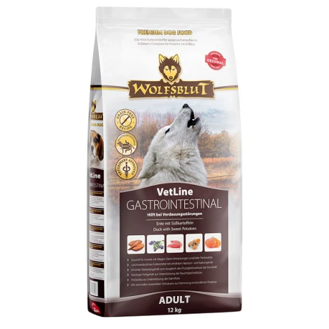 Wolfsblut VetLine Gastrointestinal - jemné a vyvážené krmivo pre psy s tráviacimi problémami. Podporuje zdravie čriev, obnovuje rovnováhu elektrolytov a uľahčuje trávenie vďaka ľahko stráviteľnému kačaciemu mäsu. Ideálna voľba pre citlivých psov!