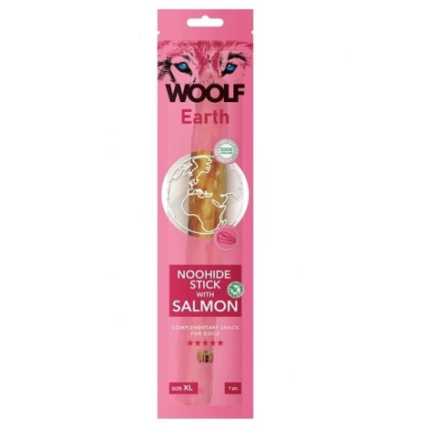Chutná a voňavá maškrta Woolf Noohide Sticks s lososom a príjemnou žuvacou konzistenciou. Je vyrobená z prírodnej želatíny a mäsa, svojou veľkosťou je vhodná pre veľké plemená psov. Ideálne na zabavenie, posilnenie žuvacieho svalstva a pohladenie mlsného jazýčka.
