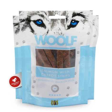 Prírodné mäsovej maškrty Woolf z lososov a mrkvy pre psov každého plemena i veku. 100% prírodný, výrazná chuť, lákavá vôňa. Maškrty Woolf sú raz varené a balené bez akýchkoľvek chemických prísad. Skrátka maškrta, ako má byť.