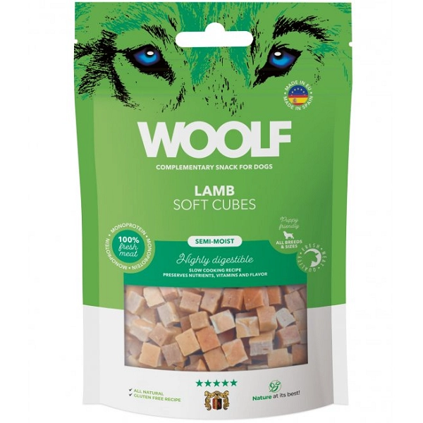 Voňavé kocky Woolf Soft Cubes z čerstvého jahňacieho mäsa, vhodné pre psy a mačky všetkých druhov. Polomäkké kocky sú veľmi chutné, vysoko stráviteľné a neobsahujú obilniny. Vynikajúca odmena, ktorá poteší nespútaného mladíka aj rozvážneho starčeka.