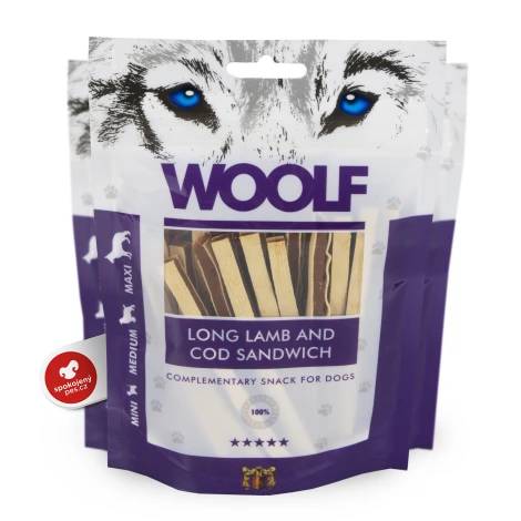 Prírodné mäsovej maškrty Woolf s jahňacím a mäsom z tresky pre psov každého plemena i veku. 100% prírodný, výrazná chuť, lákavá vôňa. Maškrty Woolf sú raz varené a balené bez akýchkoľvek chemických prísad, konzervantov, alebo farbív. Skrátka maškrta, ako má byť.