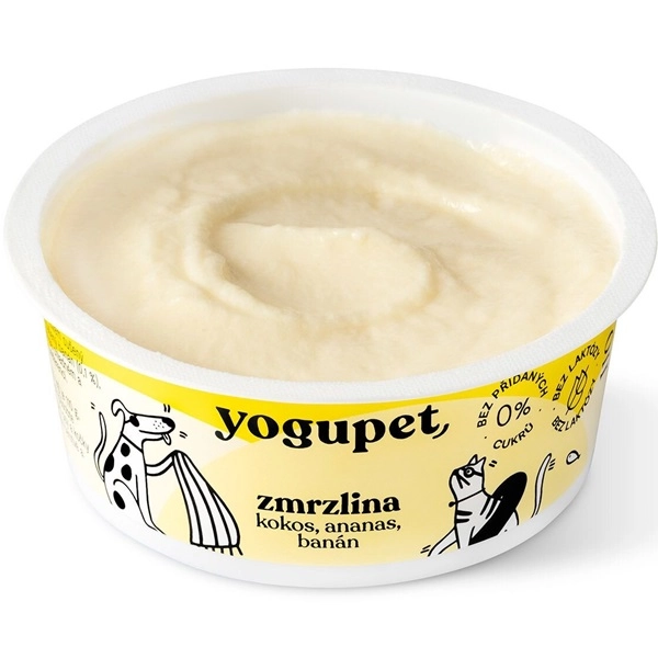 Osviežujúca pochúťka, pri ktorej sa zachveje každý chlpáč. Jogurtová zmrzlina Yogupet bola vytvorená špeciálne pre potešenie našich psích a mačacích spoločníkov. Vyrobená z bezlaktózového pasterizovaného mlieka a obohatená o zdravé prírodné zložky - kokos, ananás a banán. Táto tropická zmes je plná vitamínu A a C, minerálov, vlákniny a antioxidantov, ktoré pomáhajú očistiť telo od toxických látok, naštartovať imunitu a udržiavať zdravé črevá.